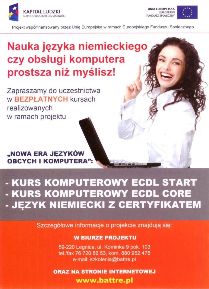 Oferujemy bezpłatne szkolenia z obsługi komputera oraz języka angielskiego i języka niemieckiego.